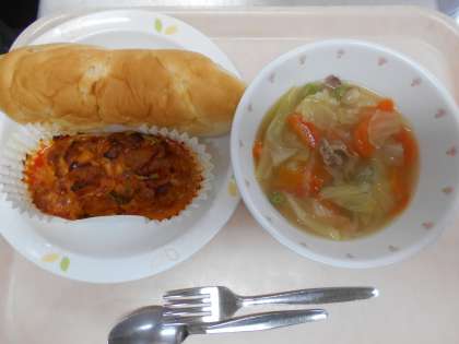 パインパン 白身魚のピザ風 白いんげんの田舎風スープ 牛乳