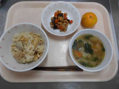 里芋ごはん 五目豆 白玉汁 みかん 牛乳
