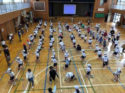 6年生、3時間目は体育館で練習しました。今年の6年生の表現ではフラッグを使って演技をします。今日は、最初ということでフラッグは持たずに動き方を学びました。膝を床に付けたままの姿勢も多く、我慢が必要な場面もありそうです。校庭で練習する時は、砂が気になるかもしれません。そういう困難を乗り越えながら本番に向けて全員で演技をつくり上げていってほしいと思います。