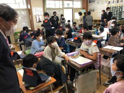 4年4組のみ5時間目を実施し、全教員がTeamsも活用しながらその様子を参観しました。その後、授業について協議し、講師の先生から指導をいただきました。授業の内容は社会科「水害からくらしを守る」でした。この時間はこれまで学習してきた内容を生かしながら、水害が起きそうなとき自分はどのようにして命を守る行動をするかを考えました。タブレットに保存したハザードマップから自分の家の場所の危険度を調べ、避難するか自宅待機をするか選択しました。しかしどちらを選択しても水害時は電気や水道が止まったり、食べ物が不足したりするなどの困難も起こることもあります。そういった可能性を考えながら、自分は水害に備えどんな取組をしておくかを決めました。校内研究の主題「主体的に課題解決する児童の育成」につながる素晴らしい4年生の提案授業でした。