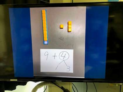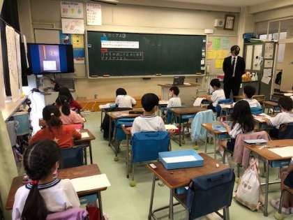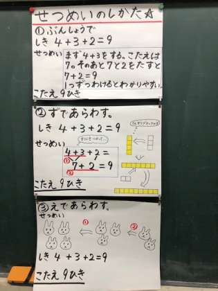 1年3組の担任は今年度教員1年目の初任者です。初任者は出張して行われる初任者研修の他に、校内でも研究授業等で研修を行っています。普段は指導を担当する教員に週2時間授業を見てもらい指導を受けていますが、この日は校内の全教員に授業を見てもらう時間でした。教科は算数で行いました。今日は「7+9の計算の仕方を考えよう」というのが内容です。まず前の時間を振り返りました。前の時間では「9+4」の計算の仕方を考え、4を1と3に分けて、その1と9を足して10を作り、最後にその10と3を合わせて計算すればよいことを理解しました。大画面テレビでその学習を振り返った後、7+9の計算の仕方を「文章」「絵」「記号などの図」のいずれかを使って説明することに挑戦しました。どの児童もいろいろな方法でノートに説明を書いていました。中には4つも説明の仕方を変えて書いている児童もいました。その後、みんなで考えを出し合い、7+9の計算は、7を1と6に分けたり、9を3と6に分けたりして「10のまとまりを作る」ことで計算がしやすくなることにたどり着きました。担任も児童もともに一生懸命に取り組んだ授業でした。