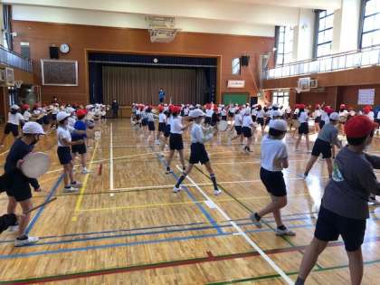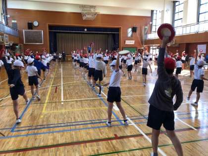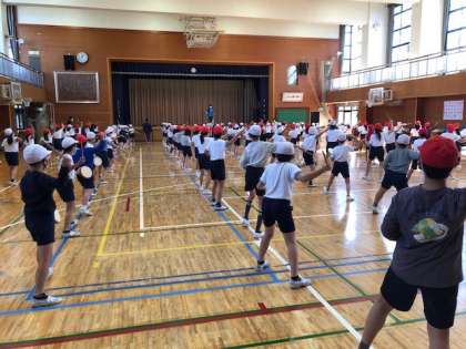 体育館から迫力ある太鼓の音が聞こえてきました。4年生の運動会表現種目「エイサー」の練習です。学年全員がそろっての練習が始まり、太鼓(パーランク)の音の迫力が増しました。今日はパーランクを回す動きを大きくすることなどを指導しました。完成度を高めるため、細かい部分についての指導が中心になってきています。あと11日でどこまで高められるか楽しみになりました。