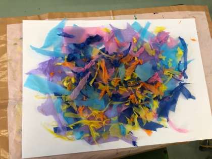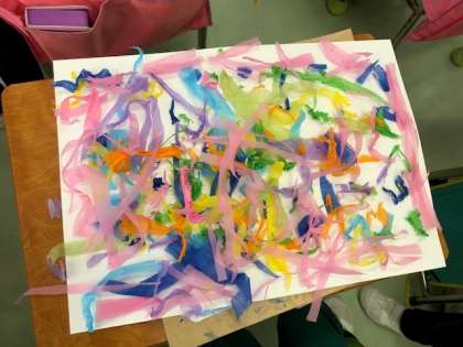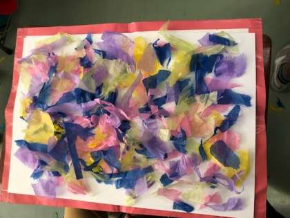2年生の図工は「のりのり おはながみで」の学習でした。お花紙を折ったり、ちぎったり、ねじったりして画用紙の上に重ねていきました。色とりどりのお花紙が美しい模様をつくり、教室中が華やかになりました。
