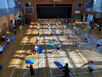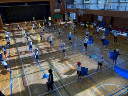 6時間目、6年生の運動会練習を体育館で行いました。今日、初めて一人一人にフラッグが渡されました。旗を使えることで児童の真剣さがさらに高まりました。降った旗が近くの人に当たらないよう気を配り、安全を意識しながら取り組めるところもさすが最高学年です。動きをそろえて力強く旗を振った時の音が爽快でした。体育館に差し込む西日が、一斉にフラッグを振る6年生を照らす様子は映画のワンシーンのように美しく映りました。