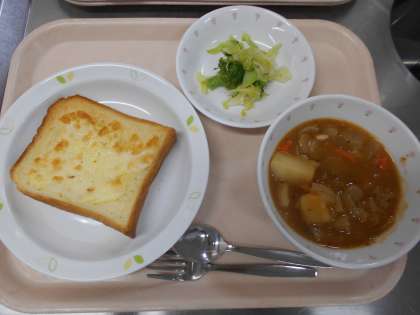 チーズトースト ビーンズシチュー ブロッコリーのサラダ 牛乳