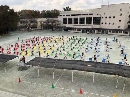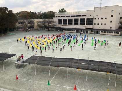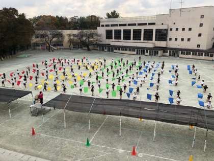 中盤はフラッグの演技です。クラスごとに違う色のフラッグを規則的に振り、集団としての美を表現します。リズムを取り、自分たちで拍をカウントしながら一糸乱れぬフラッグ演技を披露します。