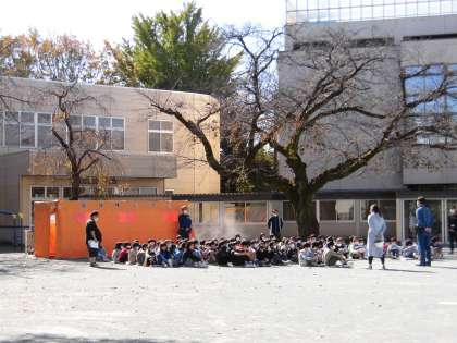 本校でも3時間目に避難訓練が行われました。今回は地震のあと給食室から出火したという想定です。「避難開始。」の指示のあと「お・か・し・も」の約束を守りながら、速やかに全校児童が校庭に集まることができました。