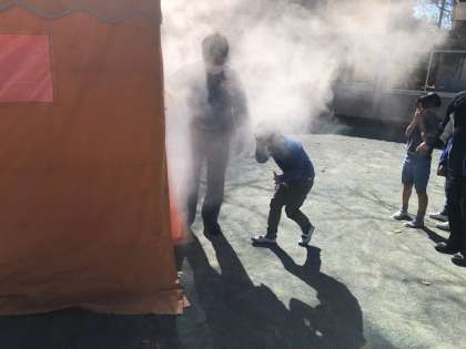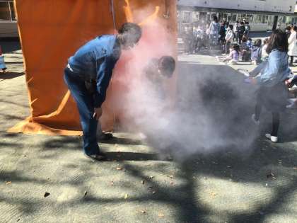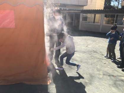 避難訓練後に行われた3年生の煙体験の様子です。ポイントは3つありました。1つはマスクとともにハンカチや洋服の袖などで口と鼻を押さえ煙を吸わないようにすること。2つ目は姿勢を低くし煙が少ない空間を移動するようにすること。3つ目は壁に近いほうの手(今回は左手)で壁を触りながら移動すること。この3つが火災発生時に建物から避難する際に大切なことだと教えていただきました。いざというときに生かすことができる貴重な体験をしました。