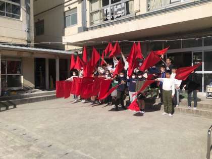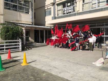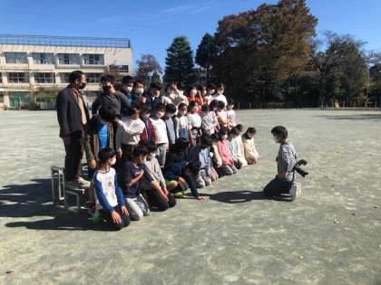 6年1組が卒業アルバムの学級写真を撮りました。すばらしい青空の下、みんなの笑顔がはじけていました。運動会を経て、たくましく、また団結力を強めているように映りました。
