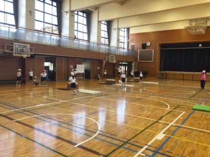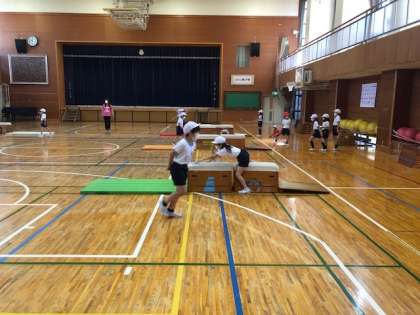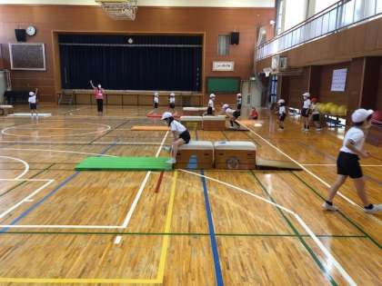 2年5組は体育館で「跳び箱を使った運動遊び」をしていました。跳び箱を2つつなげ、そこにまたがり、腕で跳び箱を押して体を前に移動させていました。「できるだけ、跳び箱を押す回数を少なくなるようにチャレンジしよう」という教員の声かけで、子どもたちのチャレンジ精神に火がつきました。とても楽しそうに取り組んでいました。