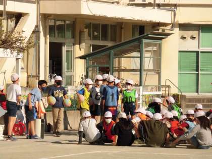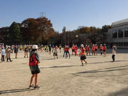 5時間目に5年生が校庭でドッヂボール大会を行っていました。実行委員の子供たちが司会をして大会を進行します。学年全体を何チームかに分けて対戦しました。