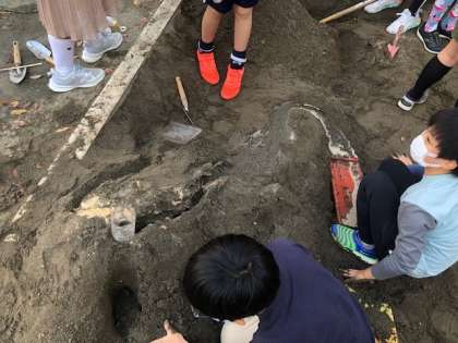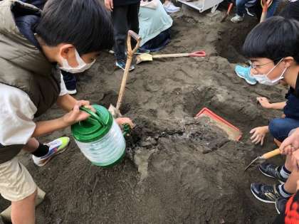 5年3組では理科「流れる水のはたらき」の学習で、砂場に山を作り、流水実験を行っていました。グループで力を合わせ、砂場の砂を高く高く積み上げていき、水の通り道を作りました。急な場所、ゆるやかにカーブする場所を意図的に作り、流れる水にはどんなはたらきがあるのかを確かめていました。水を流し終わった後は、砂が削れている場所や、それぞれの場所にたまった砂の粒の大きさなどを調べていきました。流れる水のはたらきと関係付けながら、川の上流、中流、下流の様子をよりよく理解することができました。