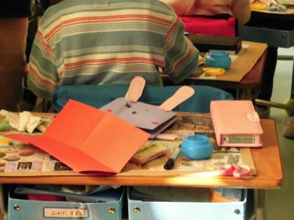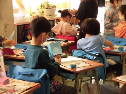 1年生の教室では、画用紙を使って、手を入れて口を開け閉めする「パクパクさん」を作っていました。最初に目・鼻・口・耳などを顔につけてから、自分で考えた飾りつけをします。長い耳をつけてうさぎのようにしたり、ひげをつけてライオンにするのでしょうか、どれも個性豊かな作品です。顔の部分が出来上がると手を入れてうまくパクパクするかを確かめる姿も見られました。