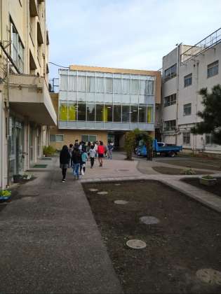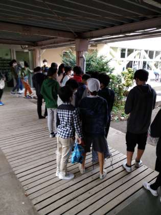 校舎の中を中学生に案内してもらいました。「広かった!」「いろいろな部屋があって、びっくりした」という声や、「家庭室の壁にはいろいろなレシピが貼ってあったので、全部、写真に撮りたかつた!」と、じっくり見学したことの分かる声も聞かれました。中学校への期待をもつことができたのではないかと思います。砧中のみなさん、ありがとうございました。