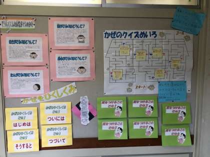 寒暖の差が大きく、空気が乾燥する季節、心配になるのは風邪の流行です。今、保健室の壁面には風邪を引く仕組みや予防法をクイズ迷路などの楽しい掲示物を通して、児童に知らせる取組をしています。たくさんの児童に見てもらい正しい知識と望ましい生活の仕方を身に付けてほしいと願っています。