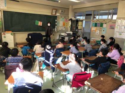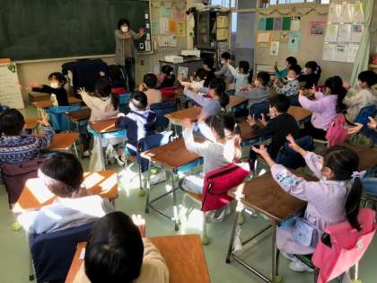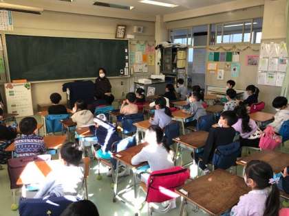 今日は3,4時間目に1年生2クラスの教室で、さくらママによる読み聞かせが行われました。ストーリーテリングの形式で、子どもたちの方を見ながら語り掛けるように物語が進んでいきます。お話が終わると、ある子どもからは「すごい!どうやって覚えたの?」と驚きの声が上がりました。45分間、集中してお話を聞くだけでなく、途中には手遊び歌でリラックスする時間もあります。本や物語への興味が高まる貴重な時間となりました。