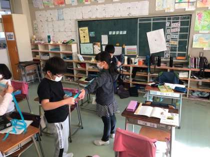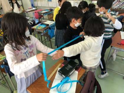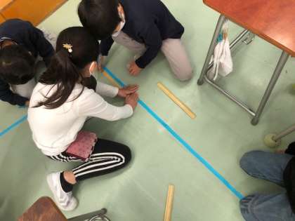 2年生の算数「長さ」の学習では、「手を広げた長さをはかろう」という課題に取り組んでいました。子どもたちが持っているものさしは30cmしかありません。手を広げた長さをできるだけ正確に測るためにはどうすればよいか一生懸命考えました。写真のように紙テープで手を広げた長さに印を付け、持っているものさしでその長さを測る方法にたどり着きました。友達と協力しながら、どの子も熱心に課題に取り組んでいました。