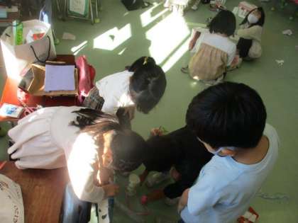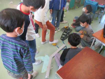 2年生は、生活科で、身近な材料を使ったおもちゃをつくって楽しんでいます。作ったおもちゃを使って遊んでみて、さらに楽しくなるように工夫して作り直したり、友達と一緒に遊んでアドバイスをもらったりと、いろいろな工夫が詰まったおもちゃができています。ビー玉を転がす「ピタゴラスイッチ」や、空気入れを使った発射台、紙コップのけん玉・・・感心してしまうおもちゃがたくさんできています。この後、どのような活動に発展するのか楽しみです。