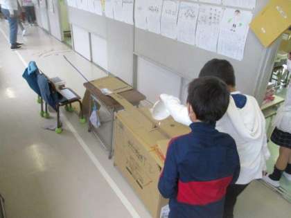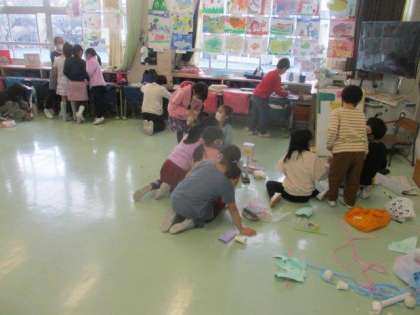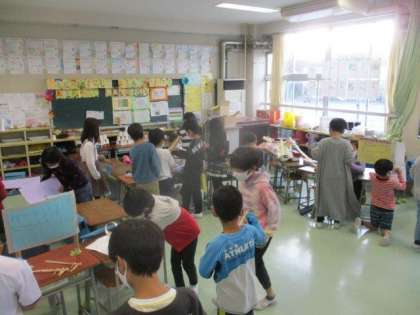 2年生では学年全体で「おもちゃ まつり」が開かれました。生活科で活動してつくったおもちゃを他の友達に紹介したり、一緒に遊んだりしました。前半・後半に分かれ、お店の担当と遊ぶ時間がありました。的当てや輪ゴムを使ったおもちゃ、動くおもちゃ、割り箸鉄砲、ピタゴラスイッチ…子どもたちの発想に驚きました。