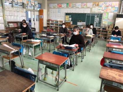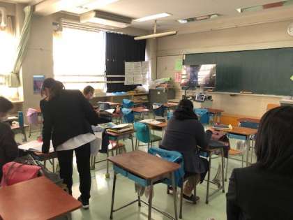 今年度の研究授業は、全教員が教室に入ると密になるため、Teamsを活用して授業の様子を配信し、学年ごとに教室を分散して授業を見ています。そのよさは、授業と同時進行で授業の分析を話し合えることです。授業中の教室では、教員同士が話し合うことはできませんが、教室が離れているため気兼ねなく授業についての議論を進めることができます。学年としてまとめた意見や質問を全体協議会の場で発信し、そこで議論を交わし、授業についての成果と課題を明らかにします。このようにして学校全体としての授業研究を深めています。