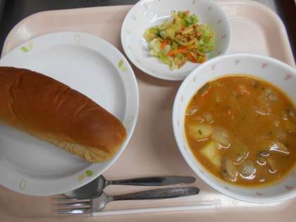黒砂糖パン ハンガリアンシチュー ごぼうチップサラダ 牛乳
