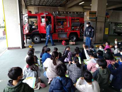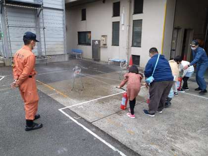 消防車の装備を説明してもらったり、消火器の使い方を教えてもらったりしました。