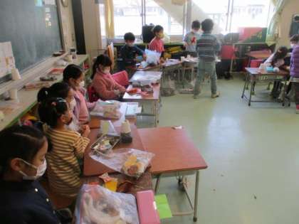 1年生が生活科で「あきまつり」を開きました。5学級が一緒に行ったので、盛大です。秋探しで見つけたドングリや落ち葉を使ってつくったおもちゃやアクセサリー、ゲームを楽しみました。他の学級のお店やさんに行って、新しい発見もあったようです。