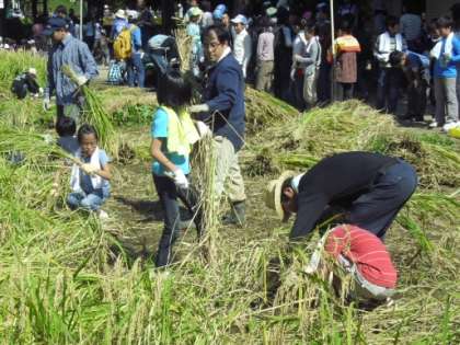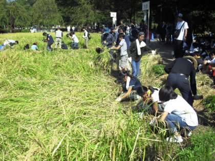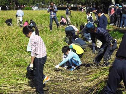 6月に次太夫堀公園で植えた稲が立派に実りました。今日は、6月の田植えに続き、初めての稲刈り体験です。稲刈り用の釜は、普通の釜と違い歯のところがギザギザです。一気に引くとザックリと狩ることができます。お米になるのが楽しみですね。
