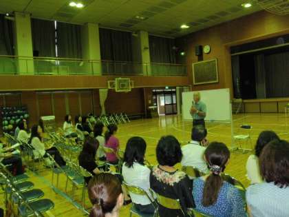 第二部は保護者の皆さんを対象に、地域在住の防災会議アドバイザーの原昭夫さまに、世田谷区における災害時の行動の仕方について、レクチャーを受けました。