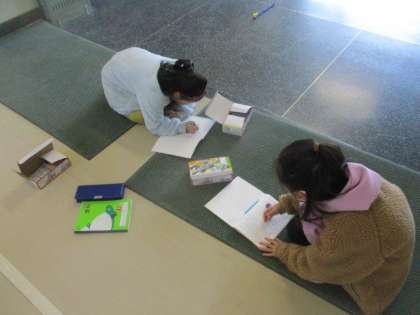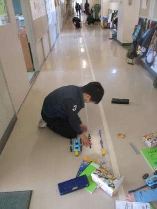 3年生が「ゴムの働き」について実験をしていました。授業をしていない教室の廊下を探して、長い距離を見つけ、自動車を走らせていました。「自動車」「ゴムを引く長さ」は同じにして、「ゴムの本数」を変えるという条件で、1本、2本・・・とゴムの本数を増やして走らせ、記録をしていました。条件を整えることは、実験では大切なことですね。どんな結果が得られたのでしょう?