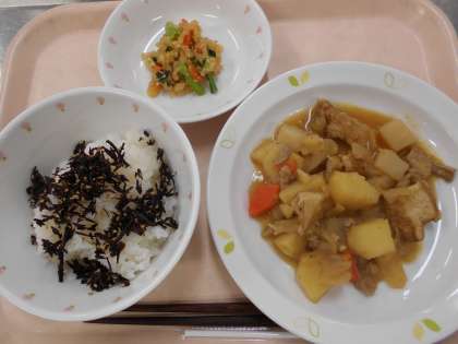 ごはん ひじきふりかけ 五目うま煮 野菜のごま和え 牛乳