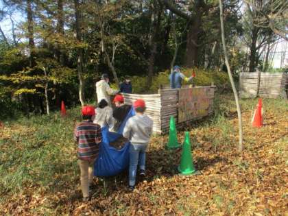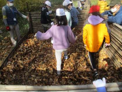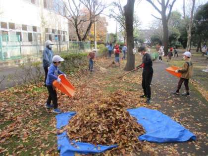 里山の落ち葉はきを3年生が行いました。せたがやトラストの方々やボランティアの方々に教えていただき、落ち葉ために、落ち葉を入れました。たくさんの落ち葉が集まり、交代で、踏みました。先日、5年生が落ち葉の切り返しをしたときには、カブトムシの幼虫など、いろいろな虫たちが出てきました。3年生が集めてくれた落ち葉にも来年になるとたくさんの虫たちがやってくるのではないでしょうか。楽しみですね。
