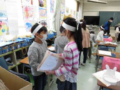 どんぐりをたくさん拾ったきつねはそれを独り占めにし、うさぎの拾った栗もほしいと考えます。うさぎは2つしかない栗の一つを譲ってくれます。それをもらったきつねは泣いてしまいます。きつね、うさぎそれぞれの心の変化を意見を出し合いながら考えました。まずは自分一人で、そのあとはペアになってうさぎ、きつねを順番に演じながら気持ちを発表しあいます。