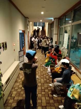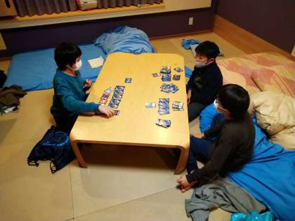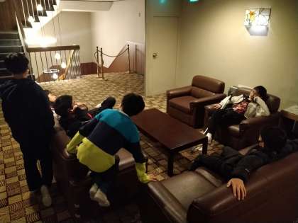 部屋でくつろいだり、お風呂に入ったりしています。お風呂からは硫黄の臭いがプンプンします(露天風呂もあるそうです)。部屋からは楽しそうな声が聞こえてきます。