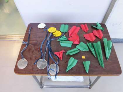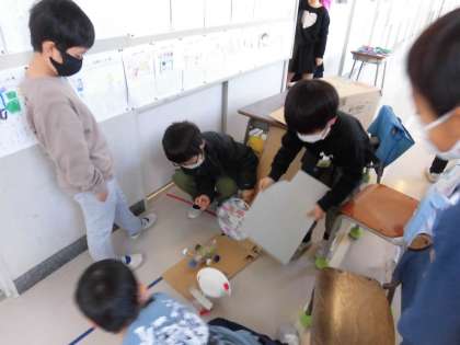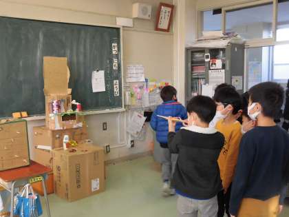 3時間目、1年生が招待を受けて2年生のおもちゃランドに出かけていきました。2階につくと廊下にまでアトラクションが作られています。近くにはメダルや景品も用意されていました。教室では2年生が時間をかけて作った射的や迷路、まちがい探しで遊べるようになっています。順番を待つ場所や、ゲームのやり方を1年生にやさしく説明してあげていました。一番の人気は射的のようで、「輪ゴムが足りないよ。」「ちょっと待って。」と係の子が忙しそうでした。「迷路はいかがですか。」「まちがい探しもおもしろいよ。」とお客さんを呼び込む声も聞こえ、1年生に楽しんでもらおうという気持ちがよく伝わってきました。