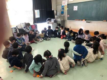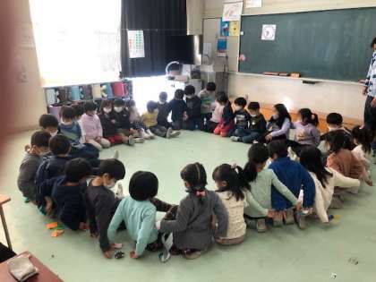 1年3組ではお楽しみ会としてプレゼント交換会を開いていました。用意するプレゼントは折り紙などで作った作品です。一人ひとつ用意することになっていました。円になって座り、クリスマスの曲に合わせてプレゼントを右隣の人に渡していきます。手を後ろにして渡していくので、プレゼントを見ることはできません。曲が終わったところで手にしていたプレゼントをもらいます。1年生は、ワクワクドキドキした様子でプレゼントを回していました。2学期の終わりに楽しい思い出ができました。