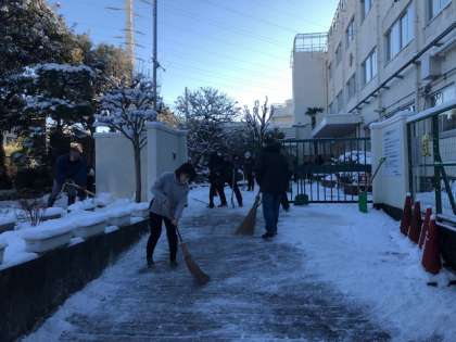今朝は昨日の雪のため、至る所が凍結し滑りやすくなっていました。出勤した職員で正門前のスロープを中心に滑りやすそうなところを整備しました。明日以降も凍結している場所が残りそうです。十分に気を付けて過ごしてください。