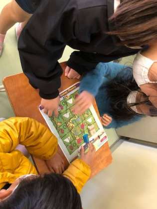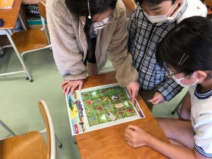 5年生の外国語では、英語ですごろく遊びをしていました。止まったところの英単語を発音しながら、マスを進めていきます。ですが、SNAKE(へび)の所に止まると戻ってしまいます。とても楽しそうに取り組んでいました。