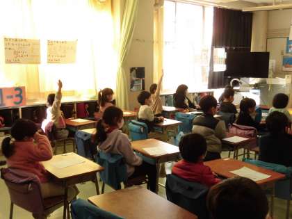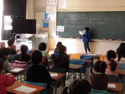 1年生の生活科で「かぞくにこにこ大さくせん」の報告会が行われました。家族を笑顔にする活動を各自で考え、冬休み中に取り組みました。