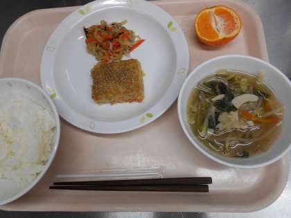 ごはん 松風焼き 大根のいそあえ 沢煮椀 ぽんかん 牛乳