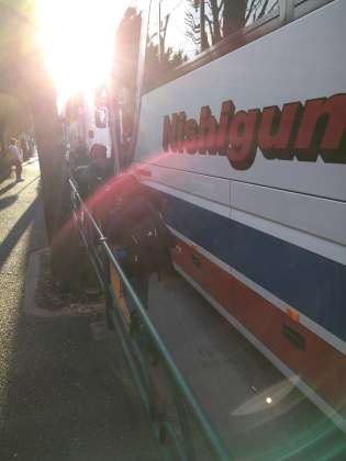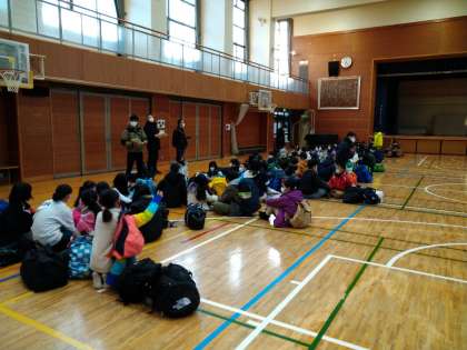 5年生1、2組の移動教室が始まりました。出発式を行い、バスが走り出しました。