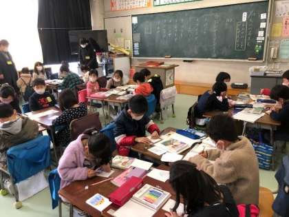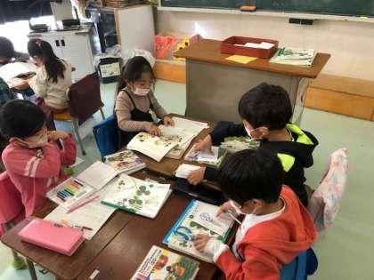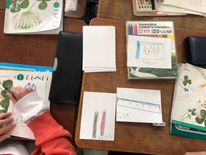 1年生の国語では「ものの名まえをあつめて、おみせやさんごっこをひらこう」という活動があります。1年2組では、グループごとにパン屋さん、アイス屋さん、文房具屋さん、帽子屋さん、お菓子屋さん・・・などと開くお店の種類を決め、グループごとに売る物の名前を出し合って、紙に絵とその名前を書いて商品カードを作成しました。力を合わせてたくさんの物の名前を出し合っていました。この活動を通し、たくさんの言葉とそれにかかわる知識を増やしました。