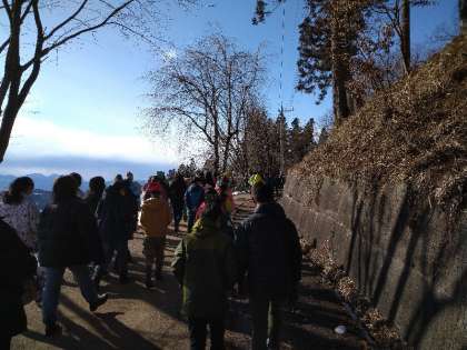 里山入門に出発です。ビレジの方が川場村のことをお話しくださっています。陽だまりは暖かいです。