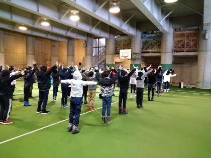 上着をしっかり着て、朝会を行いました。ラジオ体操で身体をほぐしました。
