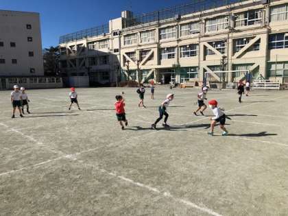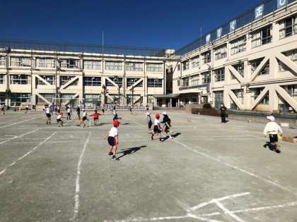 2年生の校庭体育は「宝運びおに」です。宝に見立てた紅白玉を、鬼たちにタッチされないようにゴールまで運びます。急に止まったり、方向転換をしたりと身のこなしの向上につながる運動遊びです。寒い中ですが、友達と一緒に楽しみながら全力で体を動かした子どもたちの心は温かくなったようです。