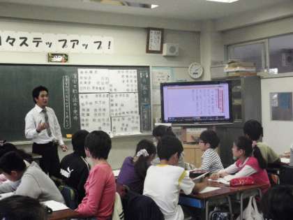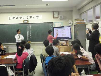 6年3組で研究授業を行いました。今日の授業は、世田谷区立小学校の先生が対象の研修会です。電子黒板を使った授業に6年3組の子どもたちが取り組みました。