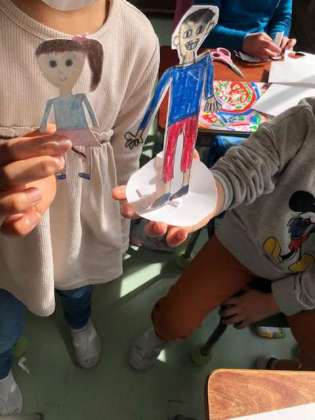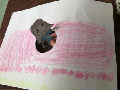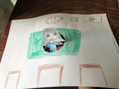 2年生の図工は「あなのむこうはふしぎな世界」です。まず主人公となる自分の絵を描き色を塗って台紙に貼ります。次に画用紙の中心に円を描き、はさみで切ります。表側と裏側に思い思いの世界を絵にします。あなのむこうとこちら側で別々の世界を表現することで、主人公となる自分は不思議な体験をします。ストーリーを作って説明してくれる子もいて、楽しい表現活動になりました。