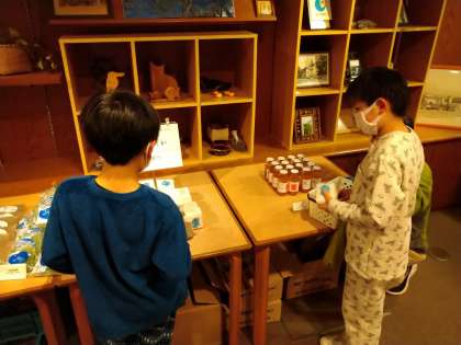 お土産を買いました。どの子も真剣に選んでいます。金額を考えたり相手の欲しそうな物を考えたり悩むことはたくさんありそうです。買った後の表情はみんな満足そうでした。