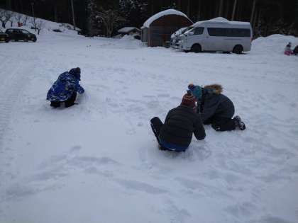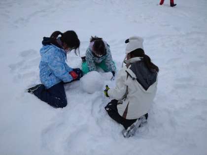 雪像作りです。お題は「ドラえもん」です。「雪がサラサラで固まらない。」「ボールみたいにならない。」という声が聞こえてきます。
