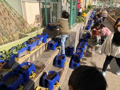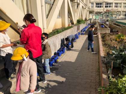 去年、アサガオを育てた鉢植えを使って、今度は春に咲く花の種を植えました。子どもたちに何の花の種を植えたのか聞いてみましたが、「わからない」との返答が、、、。どうやら何の花の種かを知らせずに活動させているようです。子どもたちはその正体に思いを巡らせ、楽しみにしていました。